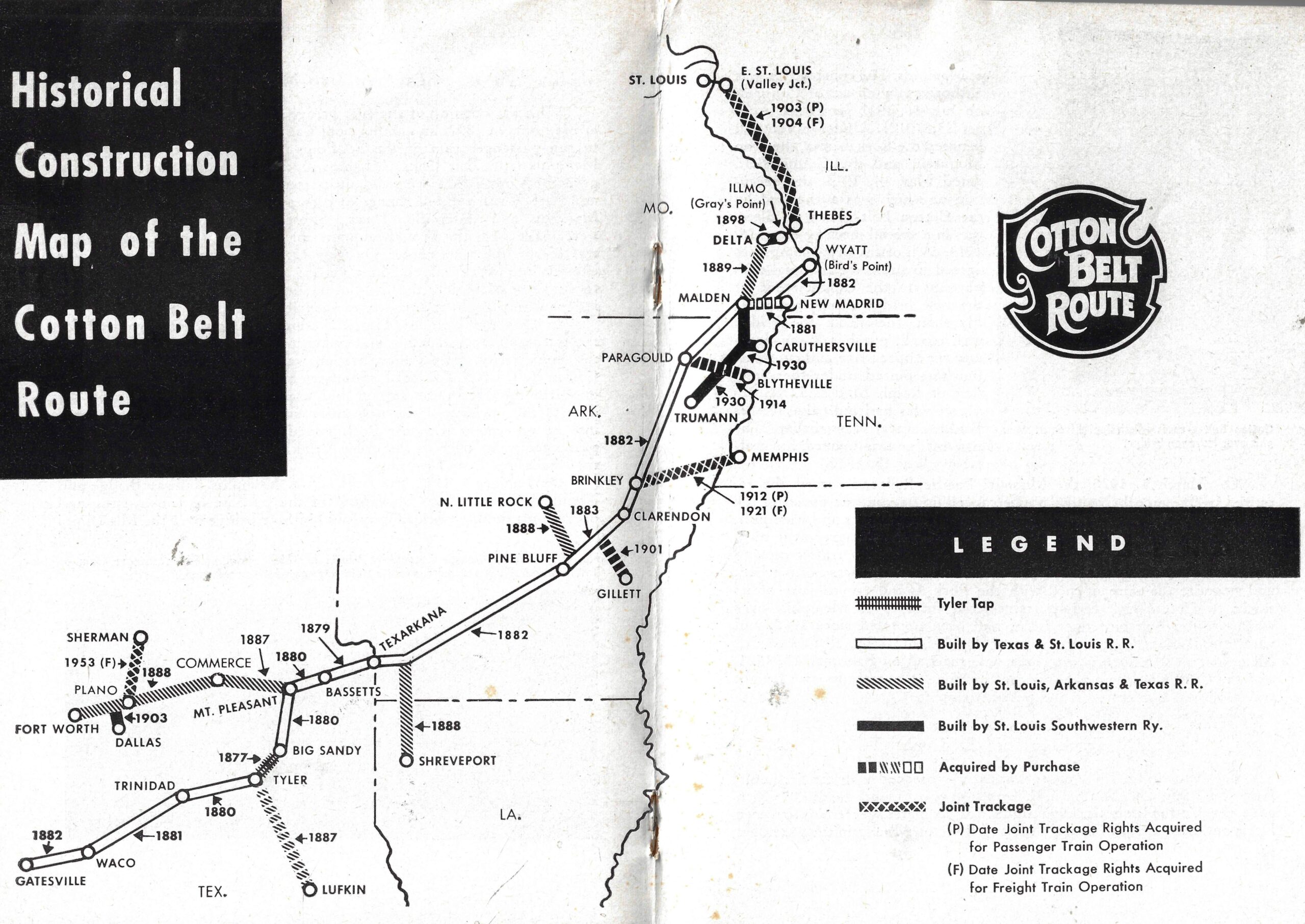Historical Construction Map of the Cotton Belt Route from A Brief History Of The St. Louis Southwestern Railway Lines (1947) by Jacob E. Anderson