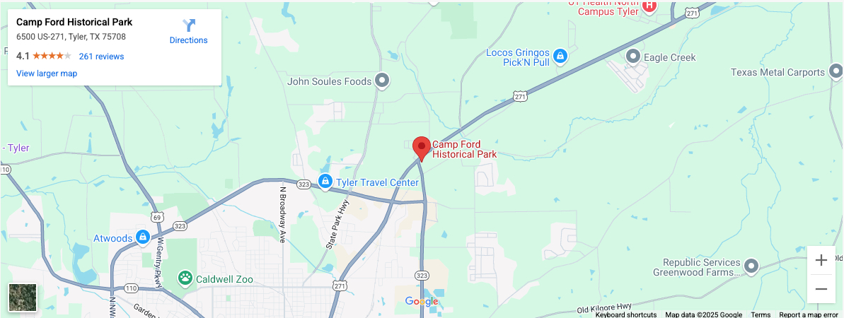 Please be aware that if you are preparing to have an organized event at the Camp Ford Historic Park, you must get permission from Smith County. Call Casey Murphy (903) 590-4607 or email cmurphy@smith-county.com