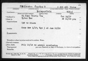 Charles was 25 years old when he joined. He was sent to Camp Travis, Texas, for basic training. His unit was responsible for supplying the troops on the battle line. He was promoted from Corporal to 1st Sergeant to Lieutenant while serving in France.