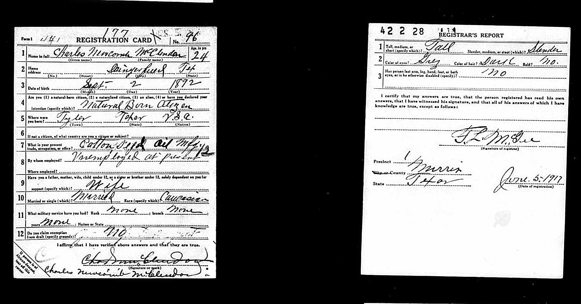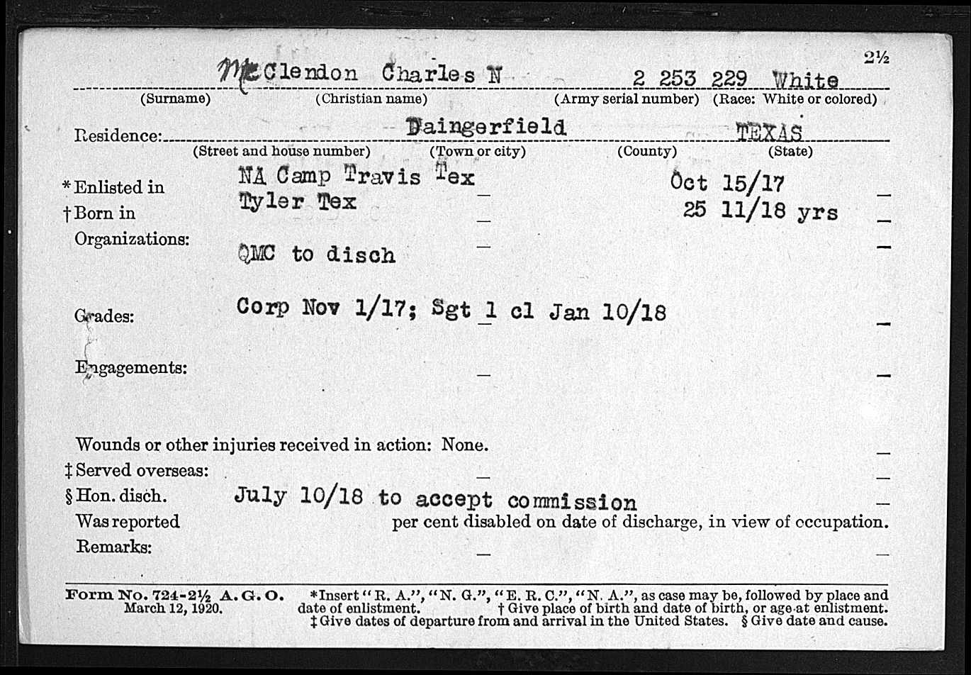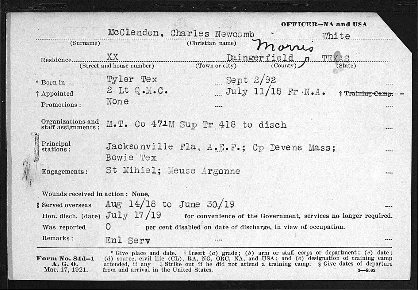 When Charles Newcomb McClendon was born on September 2, 1892, in Tyler, Texas, his father, Sidney Smith McClendon, was 27 and his mother, Annie Rebecca (Bonner) McClendon, was 24. He was the second child born of nine children. He married Norma McClendon on December 12, 1916, in Morris County, Texas. He died on January 11, 1978, in Daingerfield, Morris, Texas, at the age of 85, and was buried in Daingerfield Cemetery.