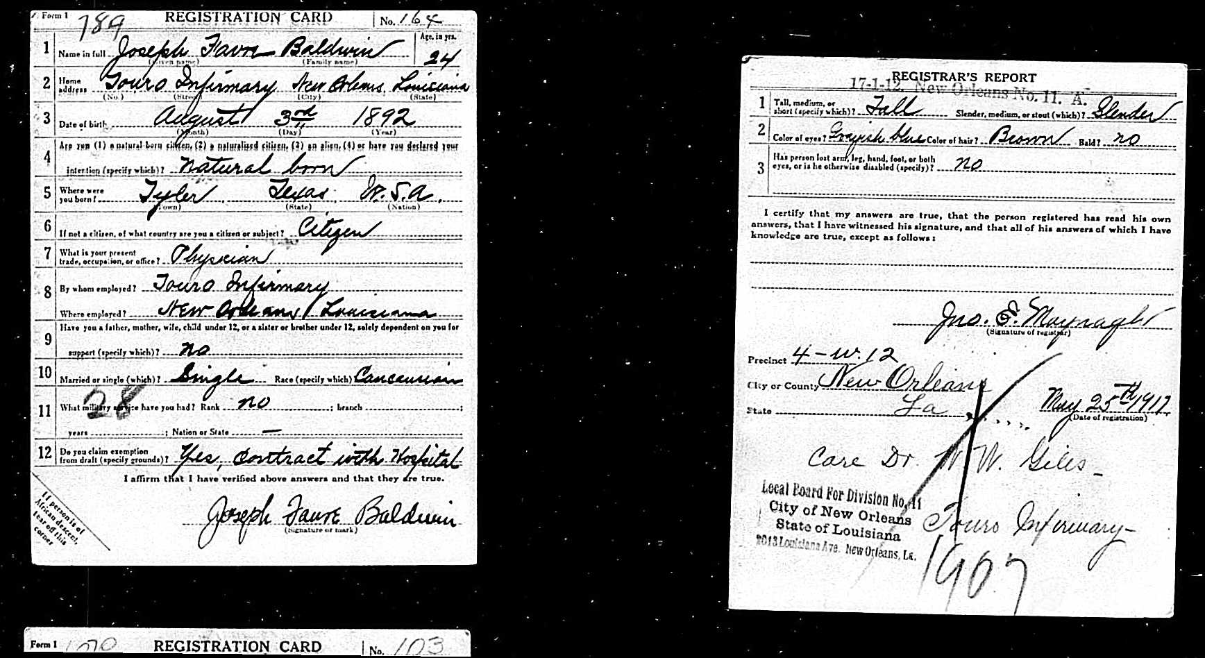 Joseph Favre Baldwin was born on August 3, 1892, in Tyler, Texas. His father, Aaron, a doctor and his mother, Clara, a concert pianist.  He had one brother, Fredrick.  He attended Tyler High School.  He was a senior Medical School student in 1915, attending Tulane University.  On May 25, 1917, when he signed his draft card, he was a Physician at the Touro Infirmary, New Orleans, LA, reporting to Dr. W. W. Giles.  He also trained at the Army Medical School, Washington, DC.  He was called into service as a 1st Lieutenant in the Royal Army Medical Corps, September 15, 1917.  Serving as a part of the 11th (Service) Battalion, he landed in France and saw action on the Western Front.