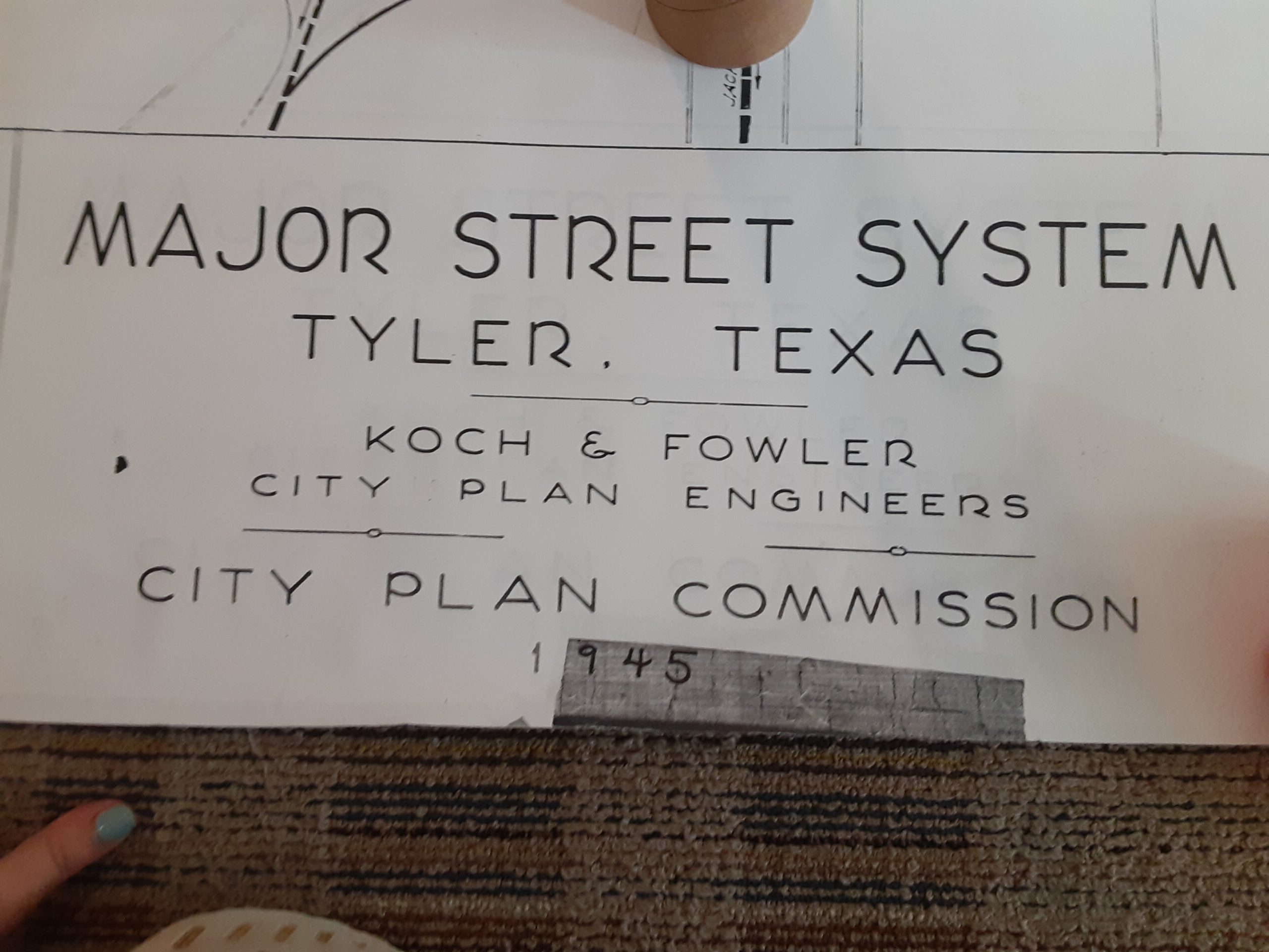 A map showing the major street systems of Tyler in 1945 when the map was first published. The original was included as a page within the city plan put together by a Dallas contractor. The map is 38″ x 31″.