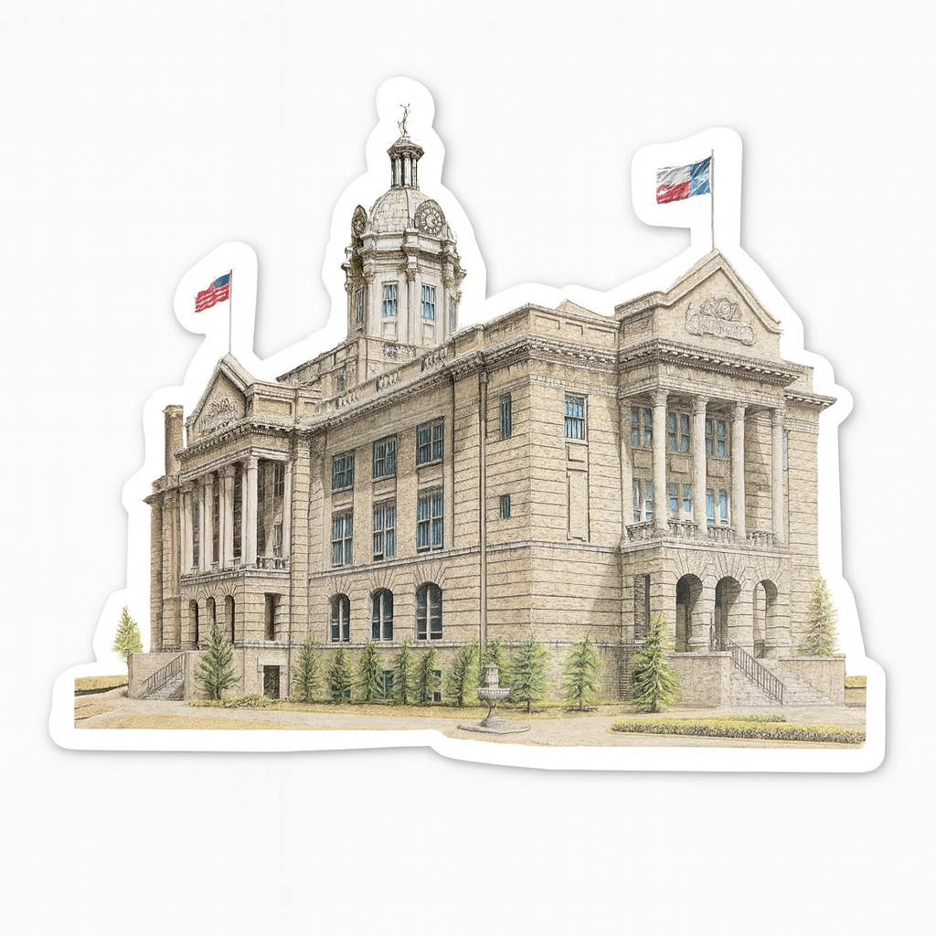 This sticker is inspired by the original artwork created in 2010 by Jack Mason. It features the shape and colors of the beloved 1909 Smith County, Texas Courthouse, a building that remains a favorite topic among visitors. Now, you can keep a reminder of its beauty with you at all times.