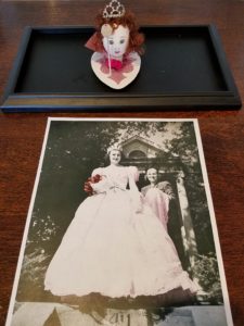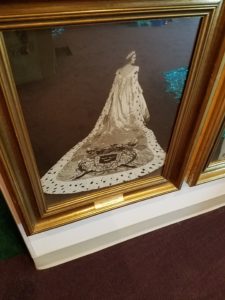 As a part of our SCHS Whimsical Blown Egg-Art Collection, one of the eggs is a custom ordered “portrait” of the 1940 Ambassador’s Queen Mary John Grelling. You can see the beautiful back of her dress in a photo from the Rose Garden on the right.