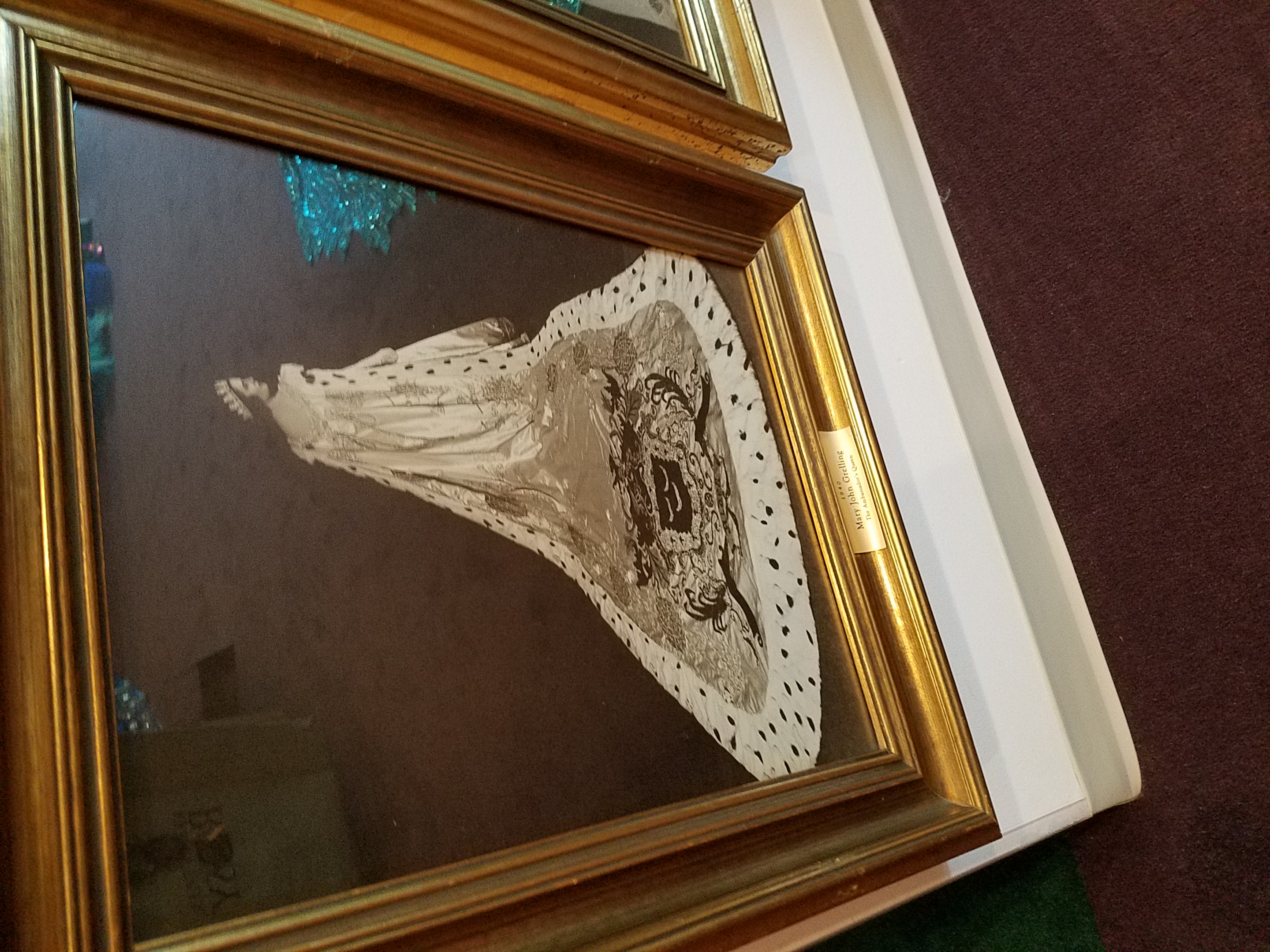 As a part of our SCHS Whimsical Blown Egg-Art Collection, one of the eggs is a custom ordered “portrait” of the 1940 Ambassador’s Queen Mary John Grelling. You can see the beautiful back of her dress in a photo from the Rose Garden on the right.