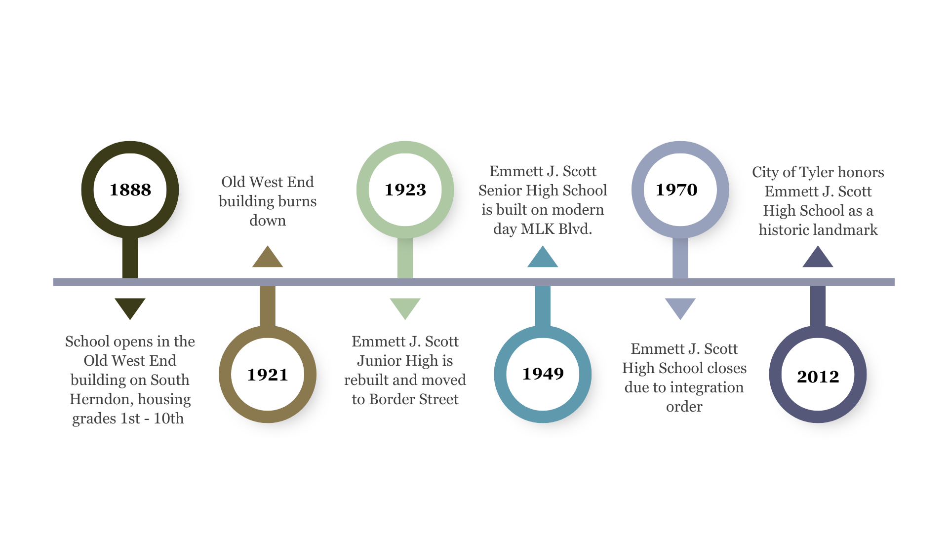 Emmet J. Scott High School served as one of Smith County’s all-black high schools from 1949 to 1970. The original school, which served first through tenth grades, opened in 1888 and had just four classrooms. The original school burned down in 1921, rebuilt in 1923 and named Emmett Scott Junior High. Scott Junior High served elementary and secondary students until 1949 when Emmett J. Scott High School opened with 26 classrooms. The new school had an auditorium, band hall, gymnasium, administrative suites, and a shop. The school closed in 1970 after a federal court ordered all Tyler schools to integrate. The Emmett J. Scott High School was awarded a Half Mile of History Award by the City of Tyler and can be viewed by clicking here